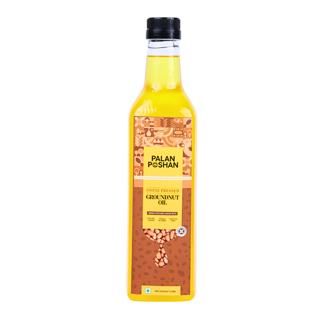 Palan Poshan Stone-Pressed Groundnut Oil (peanut oil) is made the old-world way: carefully selected peanuts from trusted farms are slowly crushed between granite stones to extract oil without heat or chemicals. We single-filter the oil below 45°C to remove natural sediments while preserving aroma, nutrients and color. Balanced taste that lifts parathas, tadka, stir-fries, and deep-frying.